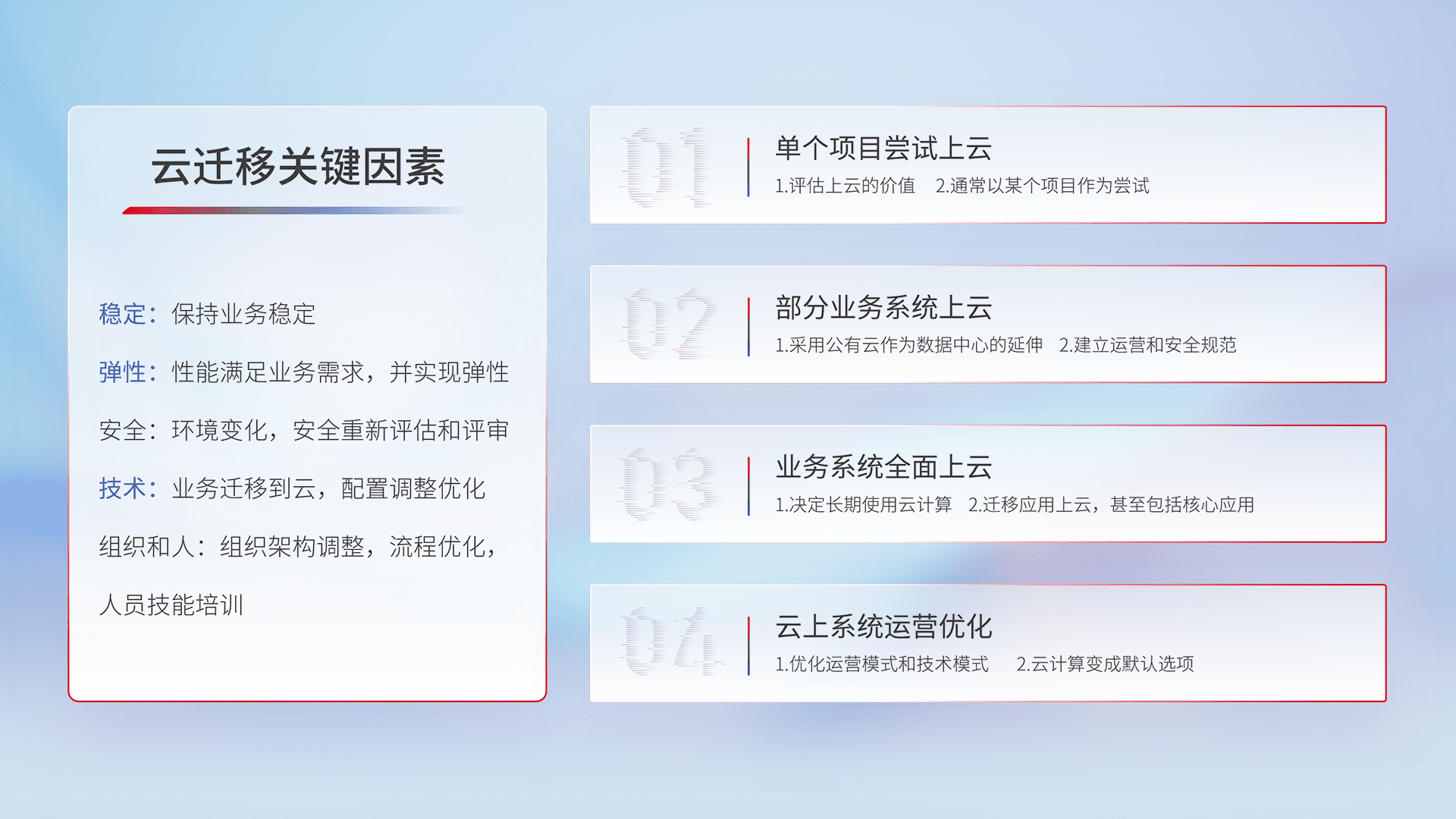 结合实际业务,,,从规划设计、、、云平台选型、、、、云原生改造、、数据迁移、、、、集成交付,,,,迁移全过程为客户识别最佳上云路径,,,做好风险识别管理,,,,设计网络架构、、、、身份权限、、、、安全审计合规、、操作审计、、日志审计、、监控告警策略、、多站点容灾设计等,,,对云上基础设施进行整体规划,,,,提升IT治理水平,,,,以满足弹性、、、高可用、、、高性能的需求。。。